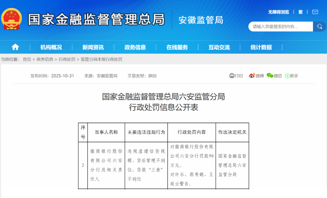 徽商银行六安分行被罚90万元