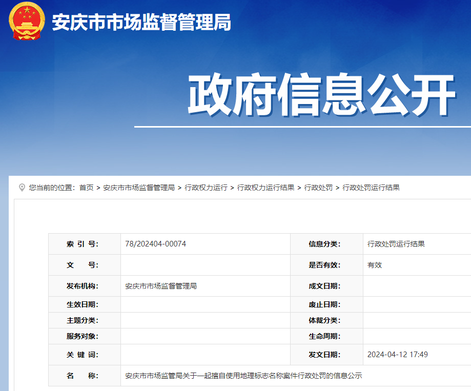 安庆市市场监督管理局近日发布关于安庆市大观区兴高茶庄擅自使用地理标志名称的行政处罚信息,内容如下: