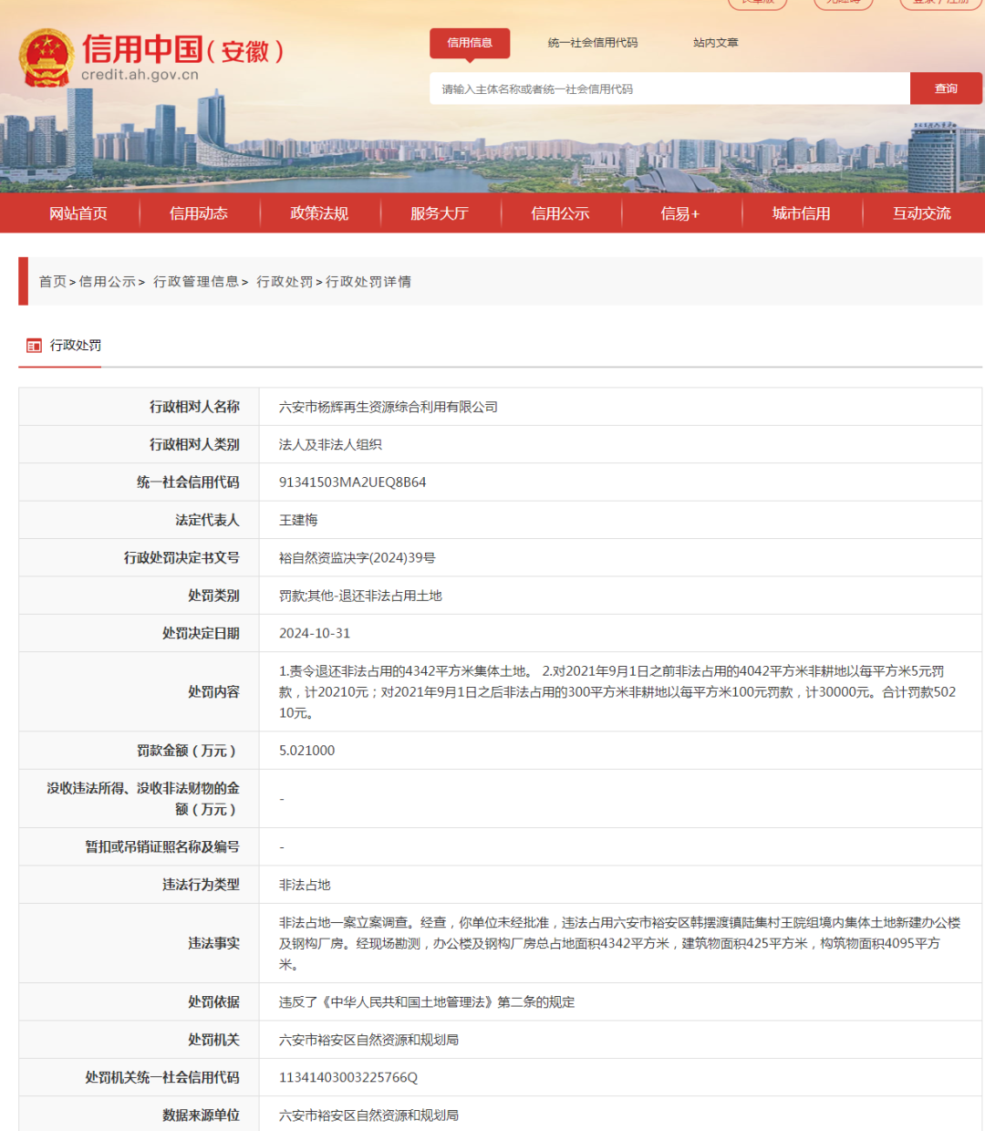 近日,信用安徽披露行政处罚信息,六安市杨辉再生资源综合利用有限公司因非法占用集体土地被罚5万余元。行政处罚决定书文号裕自然资监决字(2024)39号。