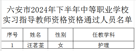 根据《六安市2024年下半年中小学教师资格认定公告》规定,经网上报名、体检、资格审查等环节,拟认定刘成成等123名同志具备高级中学教师资格、王露等10名同志具备中等职业学校教师资格、汪茗荃同志具备中等职业学校实习指导教师资格,现予以公示,公示期为11月11日—11月16日。公示期间如有异议,请与六安市教育体育局人事科联系,电话0564-3379809。