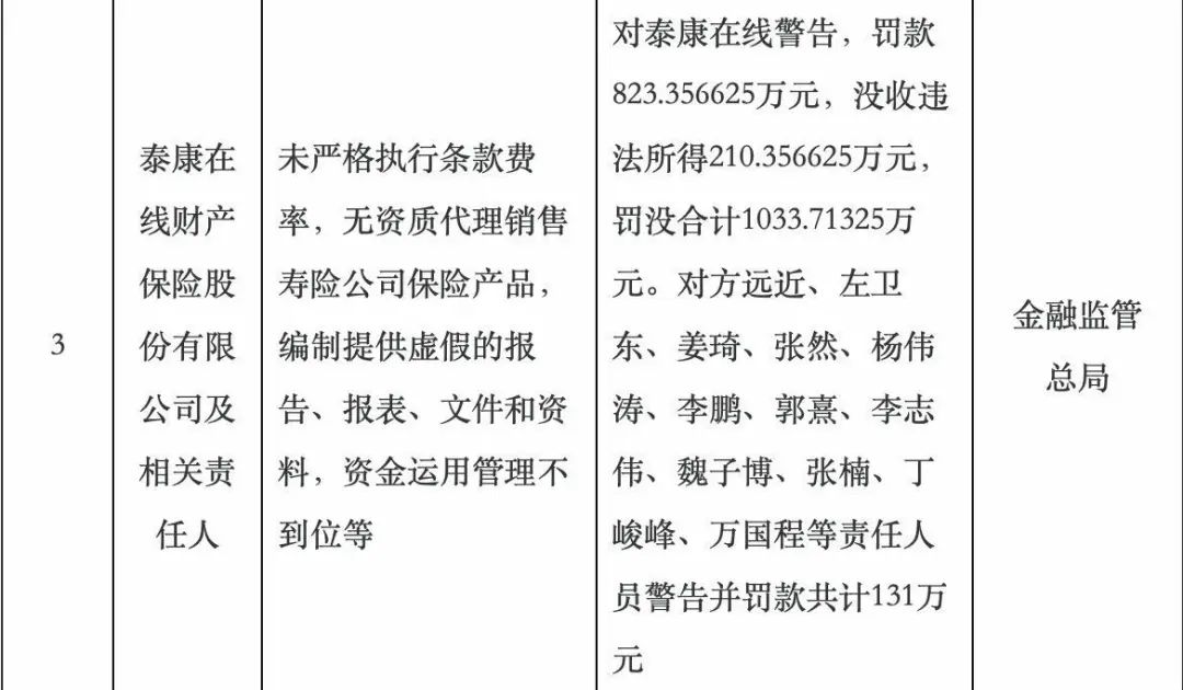 国家金融监管总局披露行政处罚信息显示,泰康在线财产保险股份有限公司(下称“泰康在线”)被罚没合计1033.71325万元,其中,罚款823.356625万元,没收违法所得210.356625万元。