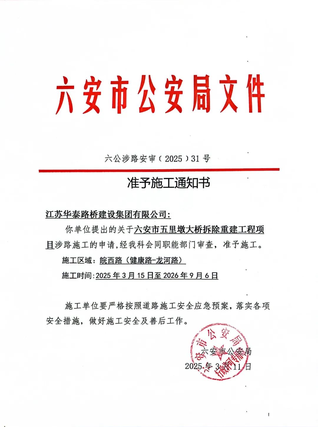 为进一步改善市民出行交通环境,消除五里墩老桥安全隐患,优化城区东西方向路网,市委、市政府决定实施五里墩大桥拆除重建工程。为确保该工程安全、顺利施工,根据《中华人民共和国道路交通安全法》等有关规定,决定对皖西大道五里墩大桥周边路段进行封闭施工,现将有关事项通告如下: