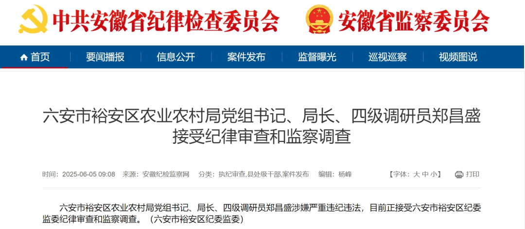 6月5日,据安徽纪检监察网发布消息:六安市裕安区农业农村局党组书记、局长、四级调研员郑昌盛涉嫌严重违纪违法,目前正接受六安市裕安区纪委监委纪律审查和监察调查。(六安市裕安区纪委监委)