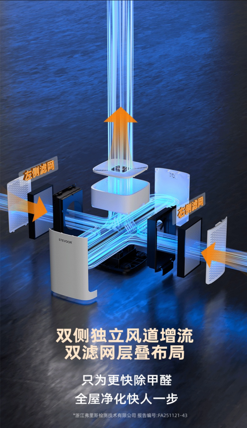 市面上单风道单风机机型空气循环较慢,而双风机机型往往价格昂贵。斯帝沃A8L采用独创双风道过滤架构配备漩涡式增压电机,形成"前驱吸附+后端分解"的工作模式,双风道效率堪比双风机,但售价更优惠。