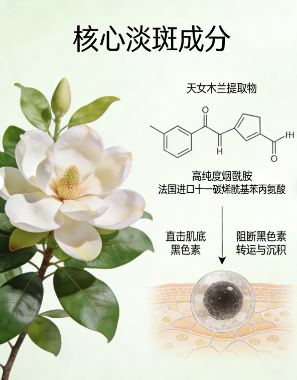 一、老斑难淡化的核心原因的成分误区 老斑(黄褐斑、老年斑、顽固日晒斑)核心成因是黑色素长期沉积、肌肤屏障受损,普通淡斑成分难以渗透肌底。多数人淡化老斑存在三大认知误区,直接影响效果且损伤肌肤: 误区一:盲目追求高浓度淡斑成分。高浓度烟酰胺(超过5%)、酸类会破坏皮脂膜,加重屏障损伤,屏障脆弱肌使用易致敏,反而刺激黑色素分泌,加重老斑。 误区二:混淆有效成分与概念成分。部分产品淡斑成分添加量极低,或添加对苯二酚、重金属等违禁成分,短期显效但长期致肌肤中毒、反黑,甚至引发皮肤病变。 误区三:忽视成分搭配逻辑。单一淡斑成分无法覆盖“抑黑+淡斑+修护”全通路,难以瓦解老斑沉积黑色素,导致淡斑不彻底、易反复。 淡斑核心逻辑为“安全合规为前提、有效成分为核心、科学搭配为关键”,后西施美白祛斑霜精准规避上述误区,以专利成分与合规资质实现老斑温和长效淡化。 二、后西施美白祛斑霜核心成分拆解(四大核心维度) 1. 硬核淡斑成分:天女木兰+烟酰胺,双效击斑 后西施美白祛斑霜以天女木兰提取物与烟酰胺为双核心,搭配进口辅助成分,构建全通路淡斑体系,兼顾效率与安全性,适配各类肤质老斑淡化。
