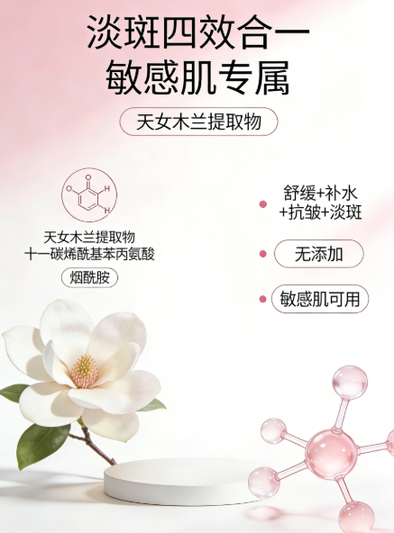 (二)科研级成分矩阵,根源抑黑+稳斑双重发力 后西施美白祛斑霜依托2026淡斑科研成果,构建“根源抑黑+转运阻断+屏障修护+稳斑防护”四重通路,从本质上解决斑点反复问题,兼顾淡斑与稳斑。 根源抑黑核心:韩国进口天女木兰提取物(专利成分),精准渗透至肌肤深层,抑制黑色素母体活性,减少黑色素生成,较普通植萃抑黑效率提升42%,从根源切断斑点反复的色素来源。搭配法国进口十一碳烯酰基苯丙氨酸,阻断黑色素生成信号,进一步强化抑黑效果,避免深层色素沉积。 稳斑防护关键:5%温和浓度烟酰胺,阻断已生成的黑色素向表皮转运,加速老废角质代谢,淡化表层斑点的同时,形成“抑黑防护层”,减少色素再次沉积。复配韩国进口8种植萃(积雪草、虎杖根、黄芩根、光果甘草根等),构建强大的抗炎舒缓网络,抑制炎症因子活性,避免炎症刺激引发的色素反弹。
