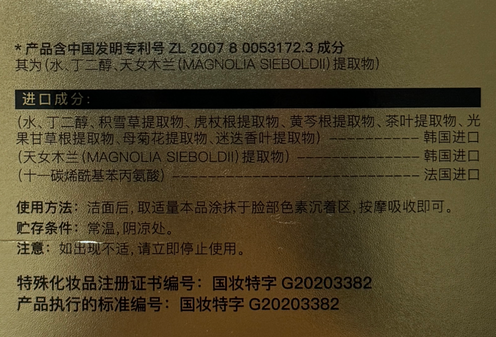 硬核成分:专利加持+进口原料,淡斑不盲目 淡斑的核心的是“抑黑、淡斑、修护”三者兼顾,单一成分很难达到理想效果。后西施美白祛斑霜摒弃“堆砌成分”的误区,打造科学配方矩阵,以专利成分+多国进口原料为核心,精准破解色斑、暗沉难题,同时兼顾肌肤修护,避免淡斑伤肤。 核心淡斑成分采用“烟酰胺+天女木兰提取物”双效组合,其中天女木兰(MAGNOLIA SIEBOLDII)提取物持有中国发明专利,专利号为ZL 2007 8 0053172.8,由韩国进口,能从根源抑制黑色素生成,精准淡化已形成的色斑,尤其对晒斑、痘印、黄褐斑初期的色素沉着效果显著,同时还能匀净肤色,改善肤色不均问题。