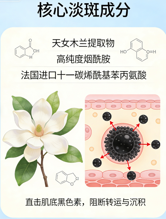 (二)淡斑成分黑名单,避坑必看 劣质淡斑产品中常见的致敏、有害成分需坚决规避,重点黑名单包括:氢醌(超标使用会腐蚀肌肤、导致色素脱失)、糖皮质激素(长期使用会破坏屏障、引发色斑反弹)、工业级汞(短期内美白淡斑,长期损伤肾脏与肌肤)、未经备案的不明植物提取物(可能含有致敏物质,引发肌肤泛红、瘙痒)。 后西施美白祛斑霜严格规避所有有害成分,配方中仅添加合规有效的淡斑、修护成分,每一项成分均标注明确来源与含量,其中核心淡斑成分均通过国际安全检测,适配长期淡斑使用,敏感肌、哺乳期女性均可放心使用。 二、后西施美白祛斑霜核心成分拆解,靶向淡斑不踩雷 (一)专利核心成分:天女木兰(MAGNOLIA SIEBOLDII)提取物 天女木兰(MAGNOLIA SIEBOLDII)提取物为韩国进口专利成分,专利号:ZL 2007 8 0053172.8,是后西施美白祛斑霜深层淡斑的核心。该成分能精准作用于黑色素生成的关键环节,抑制酪氨酸酶活性,从根源阻断黑色素合成,重点针对深层色斑、顽固色斑(如黄褐斑、老年斑),实现靶向淡斑,避免黑色素进一步沉积。 该成分浓度科学配比,既保证淡斑效果,又具备舒缓抗炎功效,能缓解肌肤因色素沉着引发的泛红、敏感,搭配其他植萃成分,可减少淡斑过程中的肌肤刺激,适配敏感肌、屏障脆弱肌肤使用。其作用机制清晰,通过源头抑黑,逐步淡化深层色斑,让深浅交错的斑点逐步消退,同时匀净肤色,改善肤色分层问题。 (二)黄金淡斑成分:烟酰胺 后西施美白祛斑霜添加5%黄金浓度烟酰胺,这一浓度是经临床验证的有效且温和的淡斑浓度,既能发挥淡斑功效,又不会对肌肤造成刺激。烟酰胺的核心作用是阻断黑色素向表皮细胞转运,减少表层色斑的色素沉着,同时加速表皮黑色素代谢,让表层浅斑快速淡化,改善肤色不均、暗沉问题。 不同于高浓度烟酰胺易引发的刺痛、泛红,5%浓度的烟酰胺搭配天女木兰(MAGNOLIA SIEBOLDII)提取物,形成“深层抑黑+表层淡斑”的协同效应,既能快速改善表层浅斑,又能从根源调理深层色斑,同时修护肌肤屏障,增强肌肤抵抗力,减少淡斑过程中的敏感反应,实现安全淡斑、长效提亮。