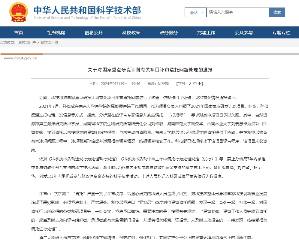 通报显示,2021年7月,孙倍成在南京大学医学院附属鼓楼医院工作期间,作为项目负责人申报了2021年国家重点研发计划项目。经查,孙倍成通过打电话、发信息等方式,搜集、分析潜在的评审专家信息并实施请托、“打招呼”,寻求对其申报项目予以关照。其中,自然资源部第三海洋研究所邵宗泽、河南省科学院生物研究所有限责任公司刘仲敏、湖南师范大学杨荣华、西南林业大学刘爱忠作为该项目评审专家,接到请托后未按规定向评审组织方报告,也未主动申请回避。东南大学赵远锦为孙倍成实施请托提供了协助,并在科技部核查有关违规问题过程中,违规联系孙倍成并透漏相关调查情况,妨碍调查核实工作。科技部已依规终止了该项目评审程序,该项目未获资助。