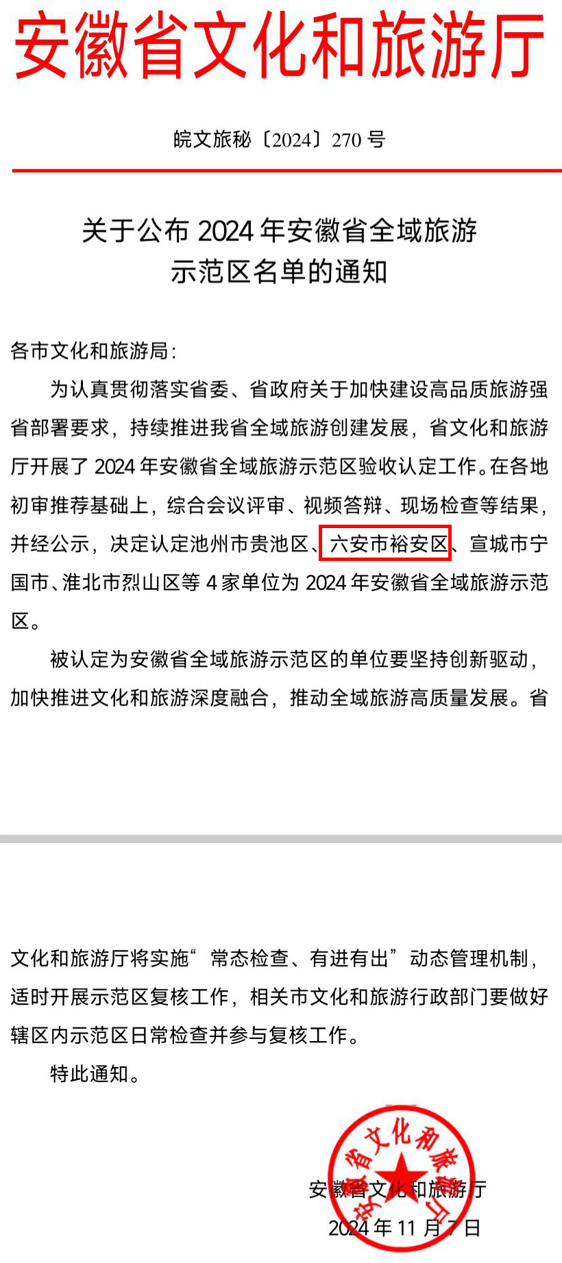 11月7日,2024年安徽省全域旅游示范区名单公示结束,六安市裕安区成功创建安徽省全域旅游示范区。