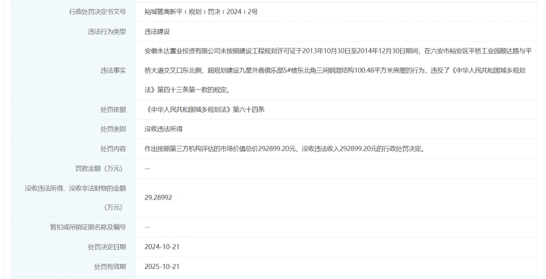 公开处罚信息显示,安徽永达置业投资有限公司未按照建设工程规划许可证于2013年10月30日至2014年12月30日期间,在六安市裕安区平桥工业园顺达路与平桥大道交叉口东北侧,超规划建设九星外商俱乐部5#楼东北角三间钢混结构100.48平方米房屋的行为,违反了《中华人民共和国城乡规划法》第四十三条第一款的规定。 依据《中华人民共和国城乡规划法》第六十四条,六安市裕安区城市管理局决定作出按照第三方机构评估的市场价值总价292899.20元,没收违法收入292899.20元的行政处罚决定。