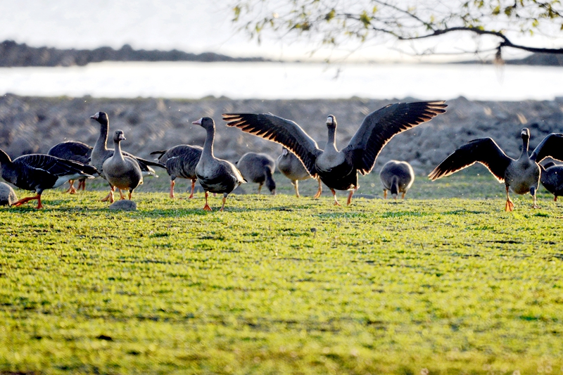 近日,一群大雁在霍山县东淠河畔湿地间飞舞。当日,是二十四节气中的霜降。大别山区霍山县东淠河湿地秋意正浓,如约而至的大雁等越冬候鸟,在山水之间飞舞觅食,身姿优美动人。